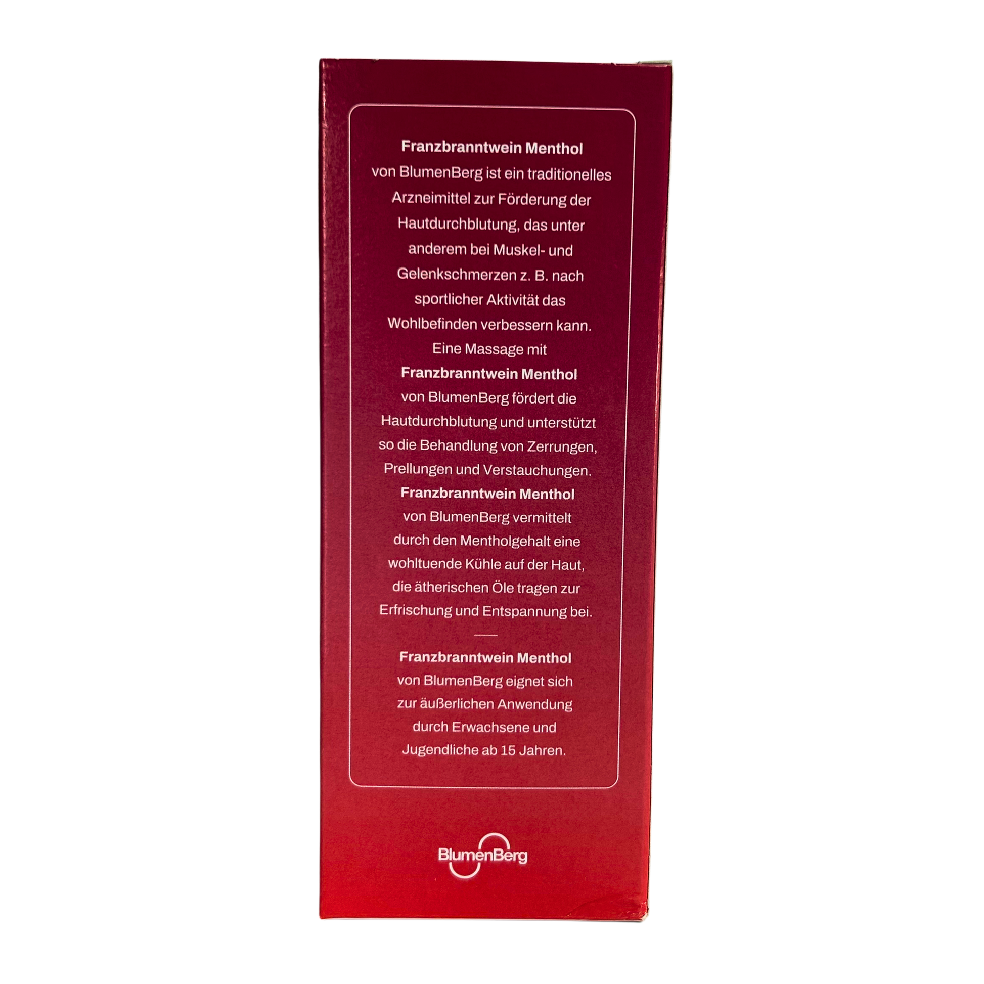 Franzbranntwein Menthol von BlumenBerg ist ein traditionelles Arzneimittel zur Förderung der Hautdurchblutung, das unter anderem bei Muskel- und Gelenkschmerzen z. B. nach sportlicher Aktivität das Wohlbefinden verbessern kann.