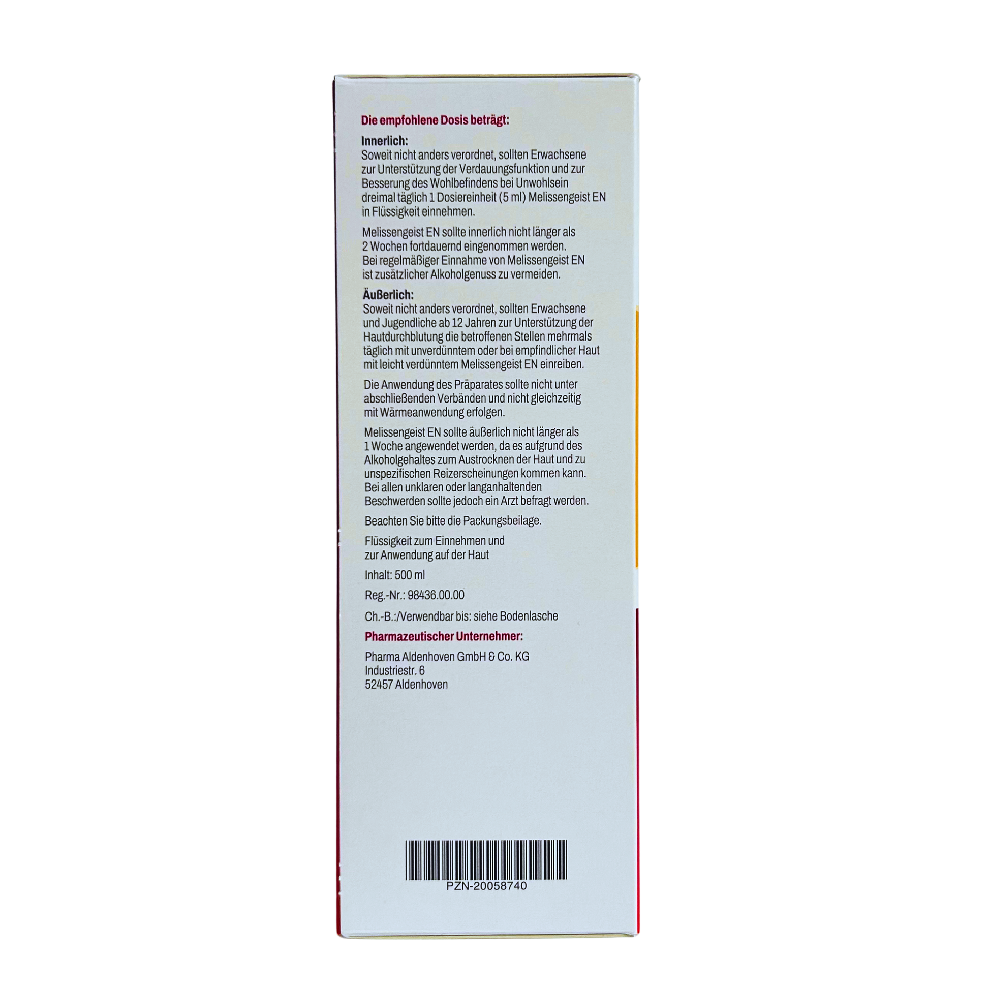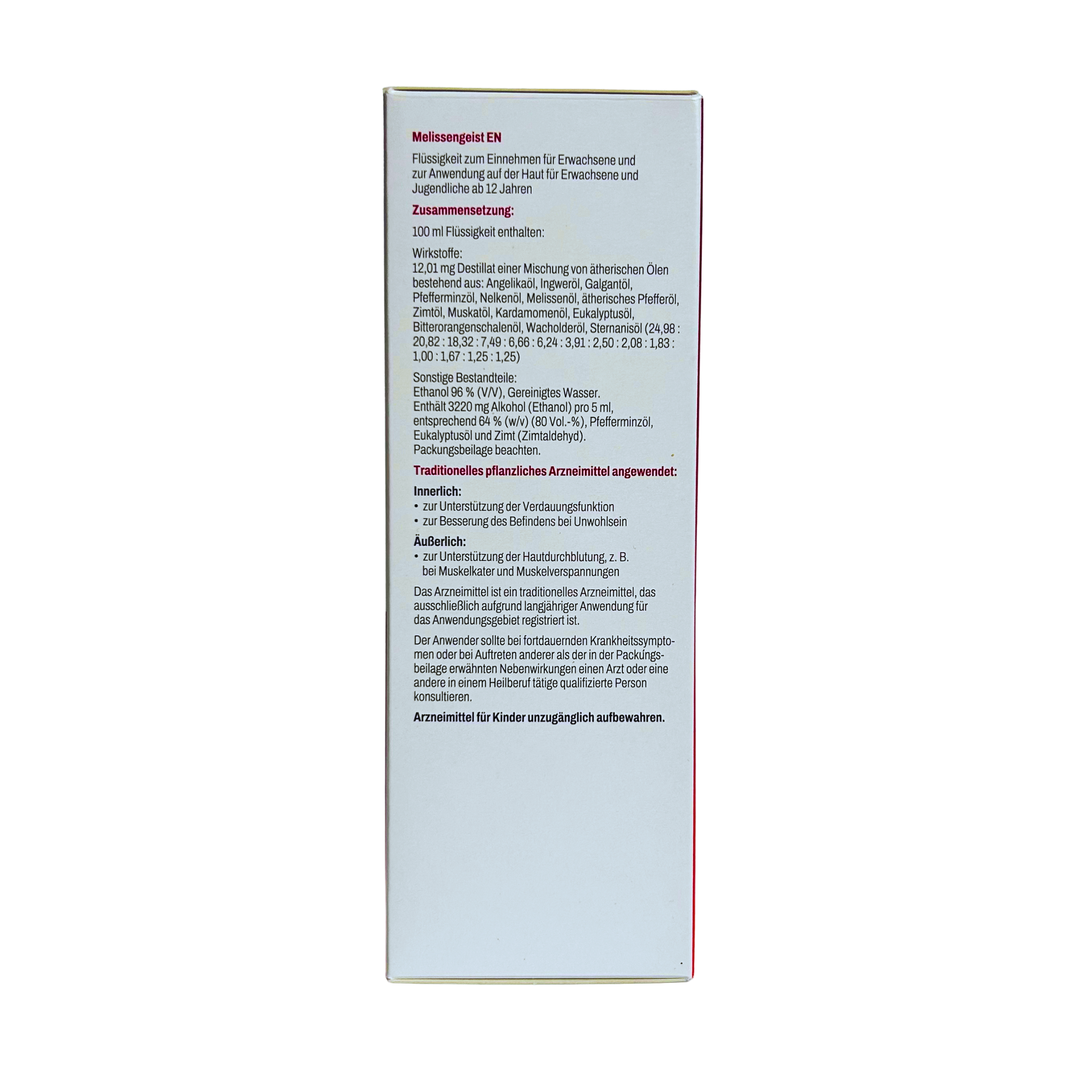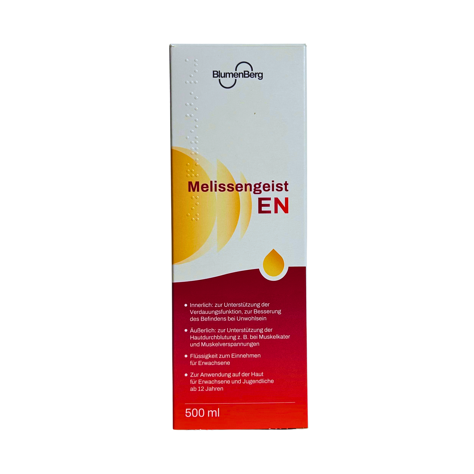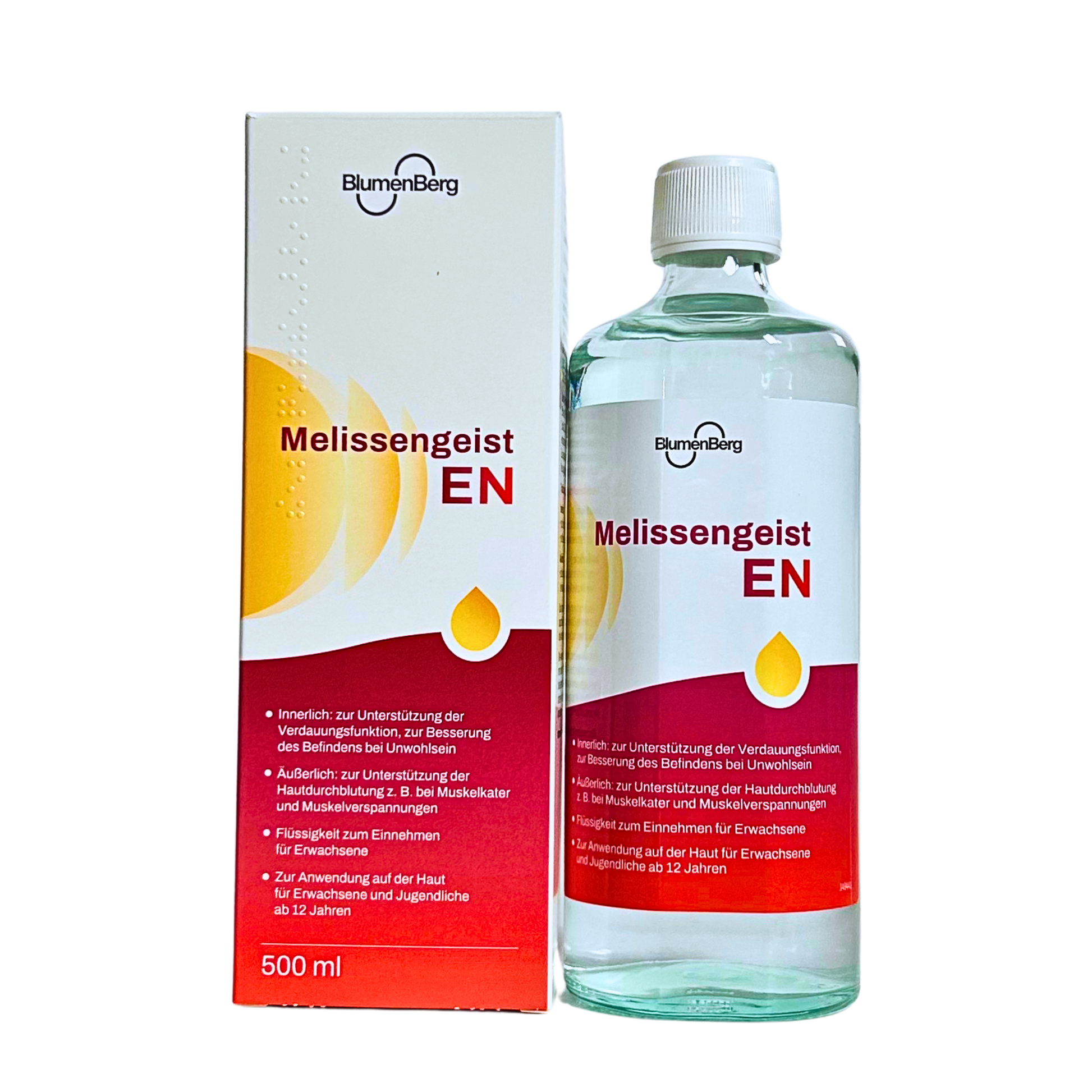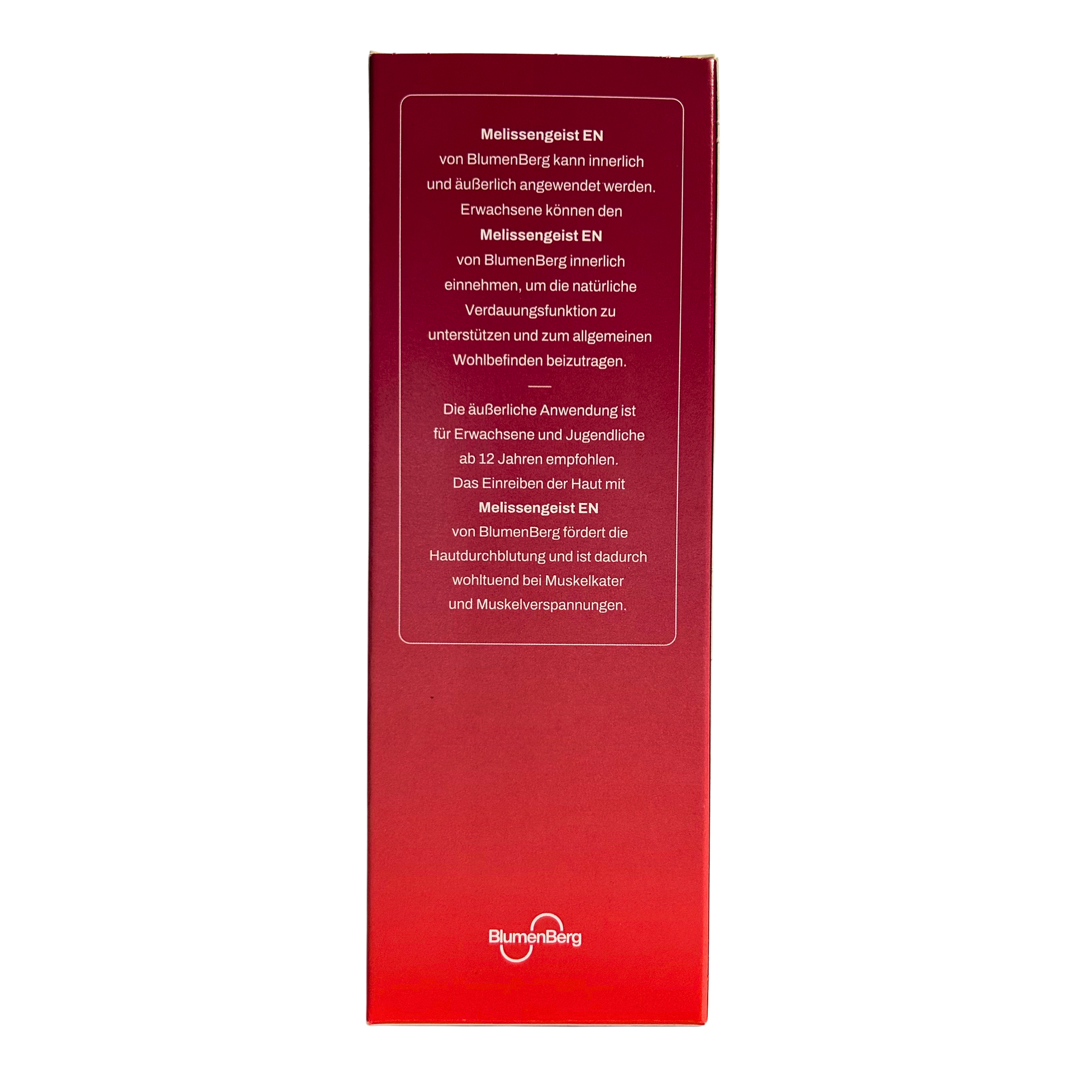 Erwachsene können den Melissengeist EN von BlumenBerg innerlich einnehmen, um die natürliche Verdauungsfunktion zu unterstützen und zum allgemeinen Wohlbefinden beizutragen. Die äußerliche Anwendung ist für Erwachsene und Jugendliche ab 12 Jahren empfohlen. Das Einreiben der Haut mit Melissengeist EN von BlumenBerg fördert die Hautdurchblutung und ist dadurch wohltuend bei Muskelkater und Muskelverspannungen.